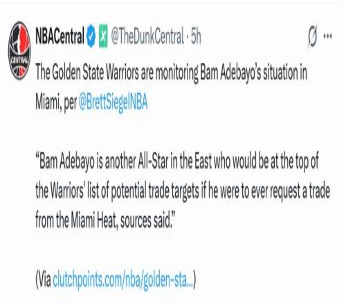NBACentral寫道:消息人士透露,勇士正在關注阿德巴約在邁阿密的情況。“消息人士稱,阿德巴約如果向邁阿密熱火隊提出交易請求,他將位列勇士隊潛在交易目標名單的首位。”