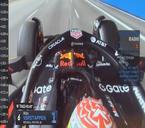 第23圈,維斯塔潘做出了最快單圈,車隊讓他全速前進,但他表示自己會竭盡所能可感覺所有的事都在和他做對(此前賽車遇到了降檔問題)。此時他和諾裏斯的差距在20秒左右,若諾裏斯進站他依舊將大概率回到諾裏斯身前。