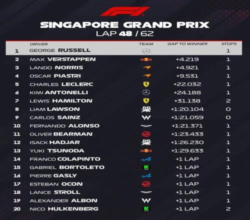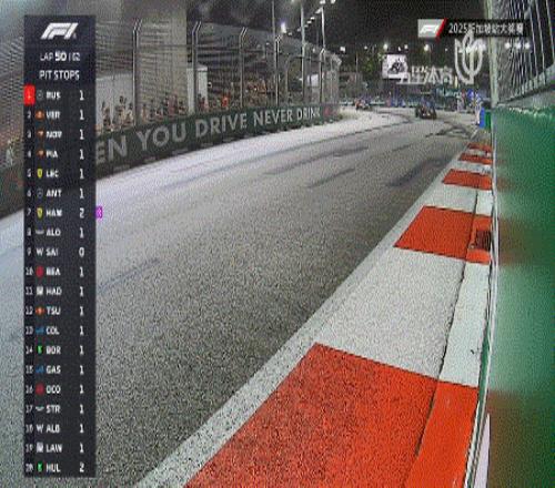 直至最後,維斯塔潘非常強硬的守住了自己的位置!最終,拉塞爾第一個衝過終點迎來格子旗的揮舞,實現Pole To Win!同時,這也是新加坡站近6年來的第6位冠軍!維斯塔潘艱難地守住第二獲得亞軍。