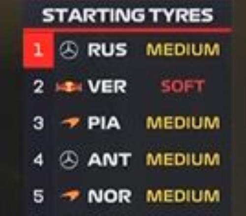 起步輪胎方麵,前十名車手中僅維斯塔潘(第2)、哈賈爾(第8)和阿隆索(第10)搭載軟胎,其餘車手均為中性胎起步,這展現出了三人和他們的車隊極為激進的策略!