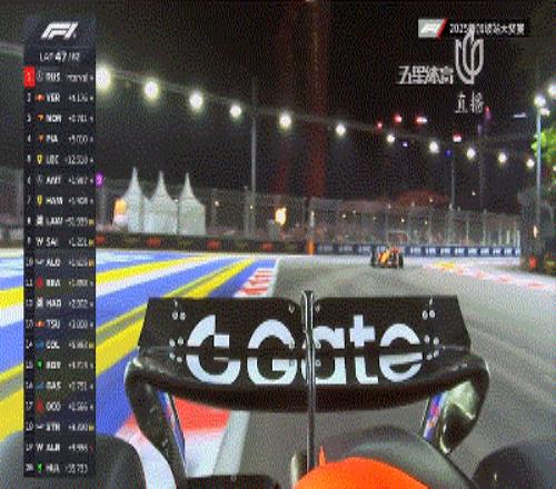 第46圈,領頭的拉塞爾已經套圈並進入到了慢車堆中,身後維斯塔潘也追上慢車降速,這讓身後的諾裏斯進入到了自己的DRS區!