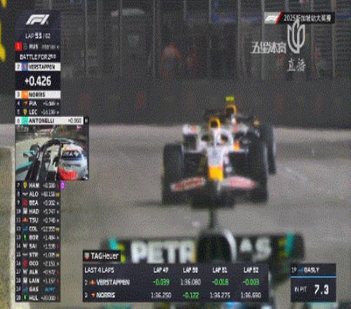 第52圈,維斯塔潘和諾裏斯追到了第11名的角田身後!後者距離身前的哈賈爾也隻有0.5秒的差距!角田麵臨著讓車和追擊積分區的抉擇。