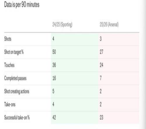 在葡萄牙,他常常通過帶球衝擊後衛來折磨他們,場均超過4次“向前推進盤帶”。而在阿森納至今,他場均隻有1次向前推進盤帶。