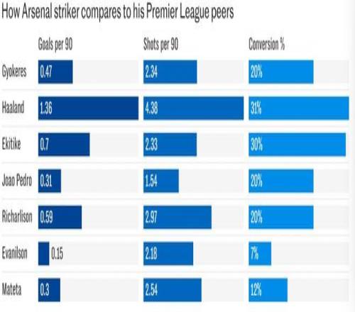 至於他的臨門一腳,他在英超20%的射門轉化率與裏沙利鬆和若昂-佩德羅等人相當,但落後於利物浦的埃基蒂克(30%)、曼城的哈蘭德(31%)和紐卡斯爾聯的沃爾特馬德(43%)。