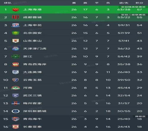 北京時間10月7日,隨著三場補賽的結束,目前的中超所有球隊都已經踢完了26場比賽,爭冠和保級逐漸明朗,其中爭冠的是海港57分,蓉城55分,申花54分。為保級而戰的球隊是梅州客家,深圳新鵬城(20分)、青島海牛和長春亞泰(18分)!