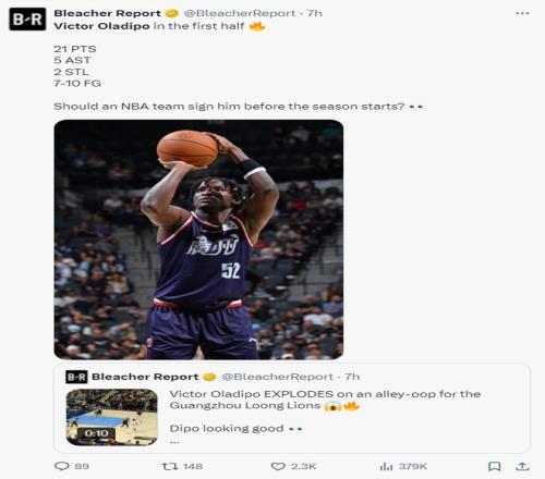 就在他上半場拿到21分+完成單臂空接暴扣後,美國媒體BR寫道:有一支NBA球隊在新賽季正式開啟前有意簽下他嗎?(這個言論實際上算間接舉薦奧迪了,因為這個狀態真的比很多現役球員更好。)