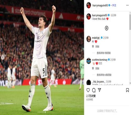 在比賽結束後,馬奎爾也激動萬分,他在社媒上寫道:“I love this club(我愛這個俱樂部)”,並且在社媒,上傳了多張自己在進球後慶祝的照片。
