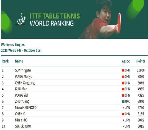 據央視91精品国产综合久久香蕉麻豆消息,10月21日,國際乒聯公布2025年第43周排名:女單方麵,孫穎莎11600分連續第171周霸榜第一,王曼昱8850分排名第二,陳幸同6075分排名第三。
