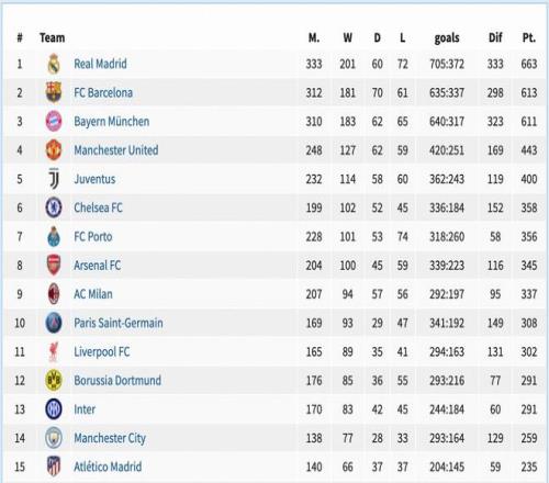 這份歐冠戰績榜的第15名是馬德裏競技,床單軍團6次進入四強3次殺進決賽,均與冠軍失之交臂。