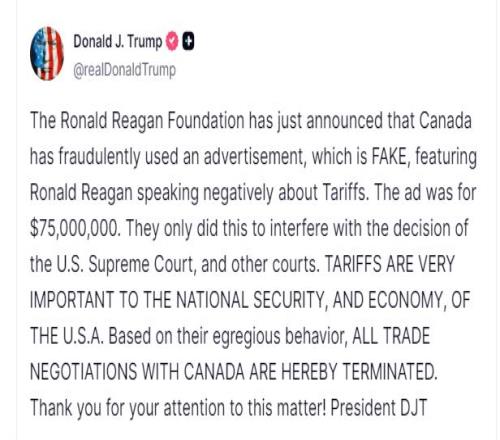 特朗普通過社交媒體表示,美國終止與加拿大的所有貿易談判。