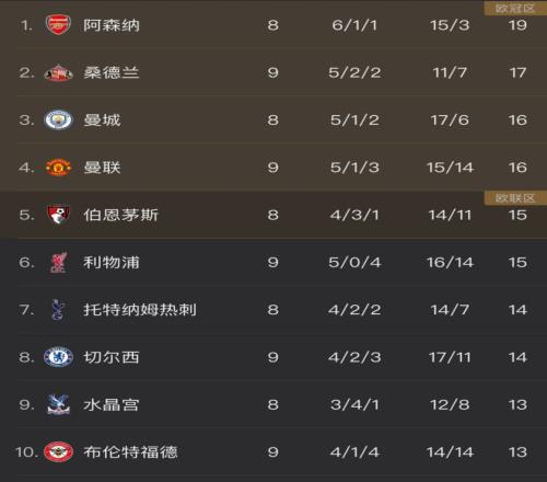 最大的意外莫過於升班馬桑德蘭,在本輪2-1逆轉絕殺了切爾西之後,桑德蘭9輪積17分已經升至積分榜第2位。“黑貓軍團”有望近年來打破升班馬下個賽季必降級的魔咒。而狀態波動巨大的切爾西,9輪後僅積14分,跌至積分榜第8位。