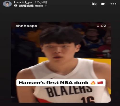 或許因為是同在國外,又或許都是大中鋒的緣故,當楊瀚森完成NBA生涯首個扣籃的時候,餘嘉豪趕緊進行了轉發。