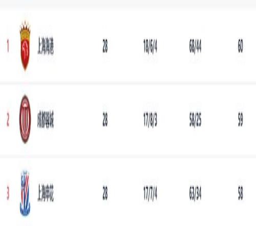 28輪之後,上海海港以60分排名榜首,成都蓉城、上海申花分別以59分、58分排名第2、3位。