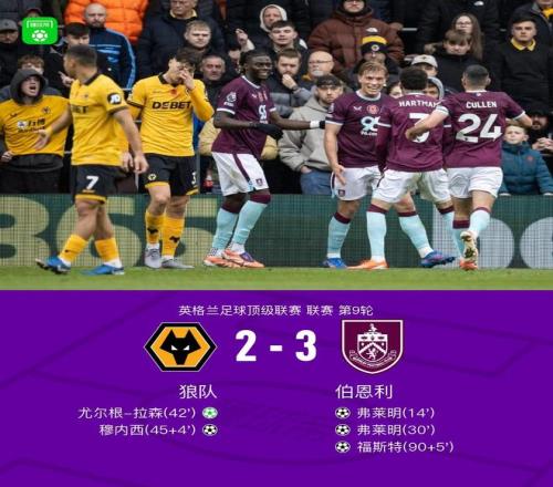 北京時間10月26日英格蘭足球頂級聯賽 聯賽 第9輪,狼隊主場對陣伯恩利。狼隊尤爾根-拉森破門,穆內西破門。伯恩利弗萊明梅開二度,福斯特破門。最終比分狼隊 2-3 伯恩利。