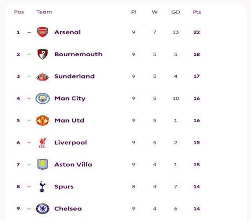 英超第9輪,積分榜形勢大變。伯恩茅斯2比0力克正在經曆賽季三次換帥陣痛的諾丁漢森林,各線連續7場不敗,18分暫列積分榜第2,身後則是17分的升班馬桑德蘭,黑貓軍團客場2比1爆冷擊敗豪門切爾西,迎來兩連勝,將曼市雙雄踩在腳下。