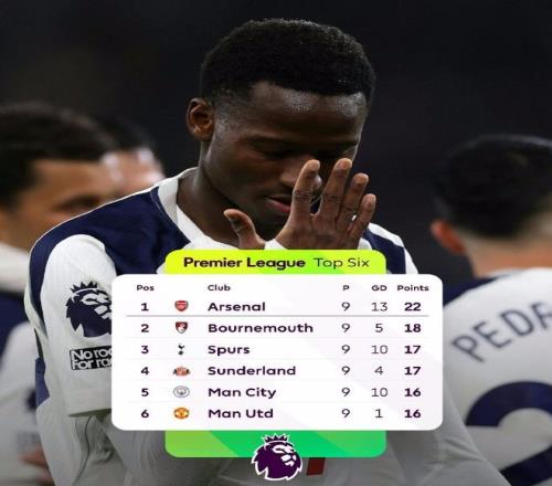 除了阿森納開局穩定發揮之外,熱刺憑借本輪客場3-0擊敗埃弗頓的勝利,積17分升至積分榜第3位,距離領頭羊阿森納5分。熱刺本賽季在前5個英超客場拿到13個積分,追平隊史在20-21賽季創造的紀錄。其他“BIG6”球隊當中,曼城排第5,曼聯第6,利物浦第7,切爾西則跌至第9位。
