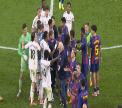 卡瓦哈爾最後對亞馬爾說:“要是你廢話太多,今天有你受的。” 亞馬爾被激怒,開始隔空叫陣,隊友們趕忙圍上來護住他,對方球員則直接與他正麵對峙。亞馬爾隔空朝著幾名對手連喊“有種出去碰碰”,直到維尼修斯在返回更衣室途中(遠遠地)與他交錯,維尼修斯對著他比劃“話太多”的手勢,亞馬爾直接“約架”更衣室。維尼修斯聞言立刻轉身狂奔接受挑戰,但最終被人攔下。