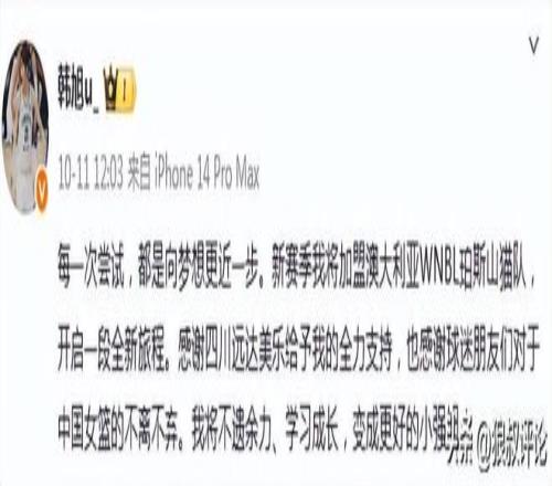 根據韓旭的社媒發文:新賽季我將加盟澳大利亞WNBL珀斯山貓隊,開啟一段全新旅程。
