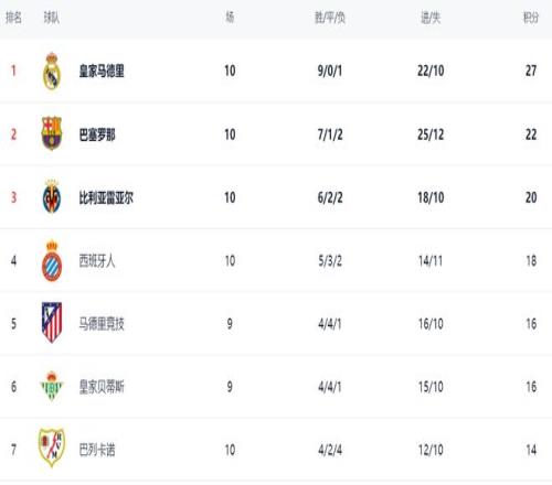 皇馬擊敗巴薩改變了爭冠格局。在積分榜上,皇馬擴大了領先優勢,27分領跑,領先第2名的巴薩5分,占據了奪冠主動權。比利亞雷亞爾以20分排名第3。第4的是西班牙人,拿到18分。馬競4勝4平1負,隻拿到16分,排名第5。皇家貝蒂斯也是16個積分,排名第6。