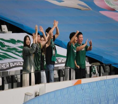 題圖說明:上海U20全運男足隊員在晉級八強後,特別感謝現場觀賽助威的球迷。