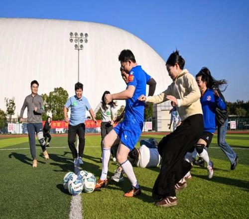 隨後的趣味遊戲互動環節更是歡聲笑語不斷。在寧央媒、省市媒體代表與蘇超南京隊的球員們隨機組隊,一起玩起了抱球繞杆接力賽,場麵十分熱鬧。