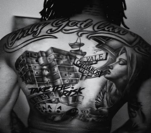 萊奧紋身的右側是聖母瑪利亞的頭像,左側是他從小生活的街區圖,中間還有兩塊路標,上麵寫著萊奧家鄉塞圖巴爾區的郵編2845。其他地方有他認可圖字母等。