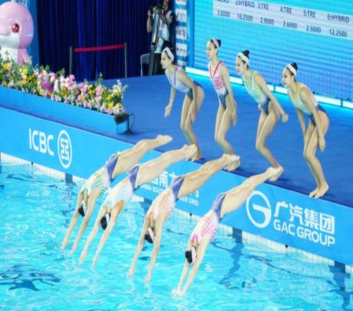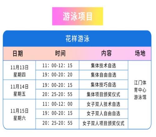 花樣遊泳作為體能、難度和藝術融合的項目,被稱為“水中芭蕾”。本次花樣遊泳項目分為集體、女子雙人兩個小項。其中,集體項目要進行集體技術自選、集體自由自選、集體技巧自選三項較量,三項成績之和總分最高的隊伍將獲得金牌,最後一項集體技巧自選將於11月14日19:00進行;女子雙人項目則進行女子雙人技術自選、女子雙人自由自選兩項較量,同樣為兩項成績之和總分更高的隊伍獲勝,金牌花落誰家,將在11月15日女子雙人自由自選比賽後揭曉。