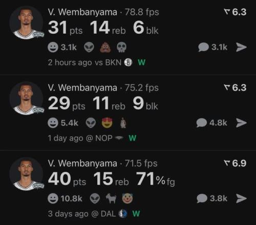 本賽季至今,三年級的文班亞馬出戰12場比賽,場均上陣34.7分鍾,貢獻26.2分12.9板4助3.6失誤1.1斷3.6帽,籃板球聯盟第二,蓋帽數則斷層領先全聯盟,投籃命中率50.2%,場均以34.5%命中率扔進1.7記三分球。