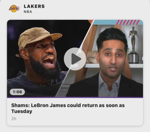 講講其他消息,同樣來自Shams的報道,詹姆斯最快在北京時間11月19日湖人主場VS爵士比賽中複出,如果謹慎點的話,最好是在11月26日湖人主場VS快船的同城大戰中複出。