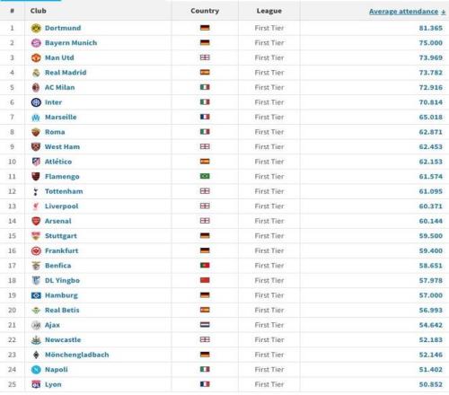 據德轉本賽季全球聯賽賽事球場均上座人數榜單統計,德國與英格蘭成為主導力量,各有六座球場進入前25名。西班牙僅有三座球場上榜,位列德國、英格蘭與意大利之後。