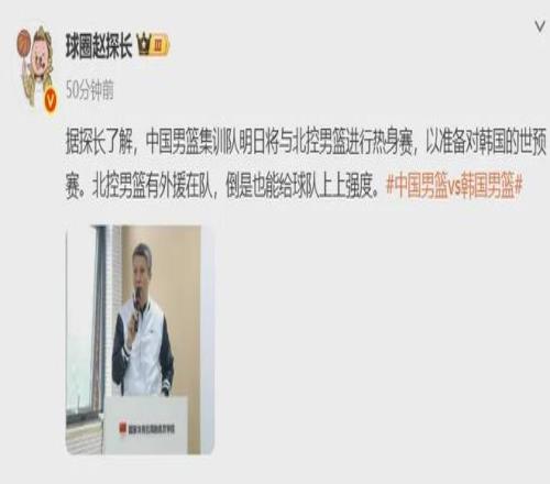 國內知名媒體人報道,中國男籃將與北控隊進行熱身賽,以此備戰11月28日(主場)-12月1日(客場)兩戰韓國男籃的世預賽。中國男籃於11月14日在國家體育總局訓練局開始集訓,11月27日結束。