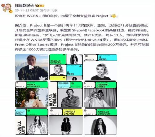 11月22日上午,李夢在社交平台發視頻官宣加入Project B。視頻中李夢表示,很榮幸加入Project B,也很榮幸能和世界上優秀的人們在一起,希望女籃人越來越好。
