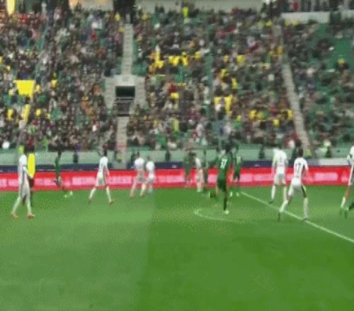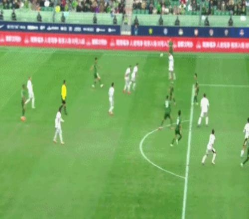 第6分鍾,張玉寧頭球擺渡,奧馬爾鬆解圍失誤,法比奧轉身掃射破門,但主裁判判罰越位在先進球無效。