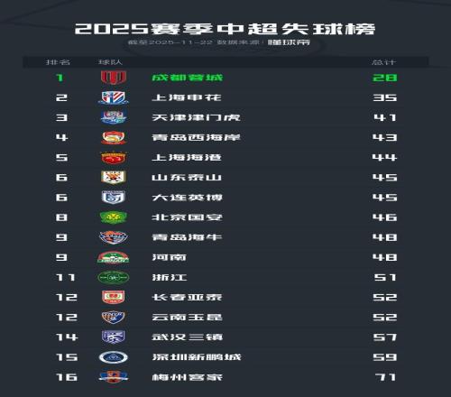 2025賽季中超丟球最少榜: