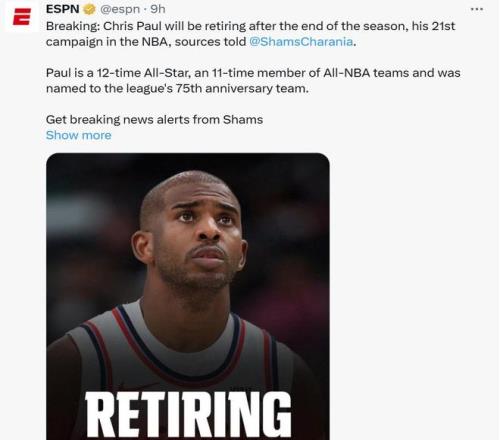 根據ESPN名記Shams報道,在對陣家鄉球隊黃蜂隊之前,保羅通過社媒宣布將在本賽季結束後退役,開啟最後一舞退役巡演,NBA生涯止步21個賽季。