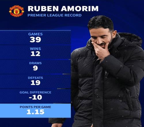 本場輸球後,過去這一年裏,阿莫林帶隊出戰聯賽39場,僅取得12勝9平19負,勝率僅為3成,輸球率卻接近5成。場均拿分隻有1.15分,淨勝球為-10,各項關鍵指標都難言理想。