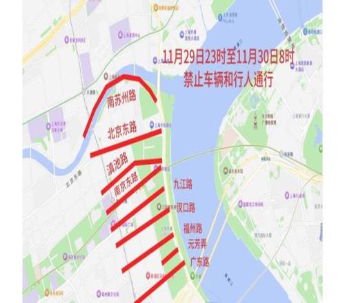 一、11月29日23時至11月30日8時,南蘇州路雙向(中山東一路—河南中路)、北京東路雙向(中山東一路—河南中路)、滇池路雙向(中山東一路—江西中路)、天津路(江西中路—河南中路)、南京東路(中山東一路—河南中路)、九江路(中山東一路—河南中路)、漢口路(中山東一路—河南中路)、廣東路(中山東一路—河南中路)、福州路(中山東一路—河南中路)、元芳弄(中山東一路—四川中路)禁止車輛和行人通行。