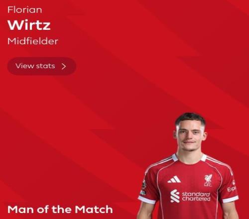 英超第14輪,利物浦主場1-1戰平桑德蘭,維爾茨當選英超官方全場最佳球員。