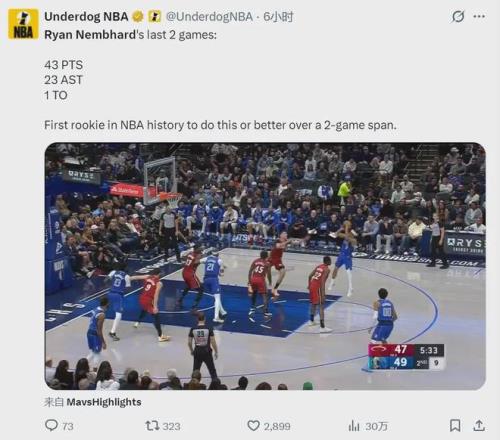 NBA從來不缺“小人物”逆襲的故事,今天聊一聊獨行俠新秀瑞安-內姆哈德,他是步行者後衛安德魯-內姆哈德的親弟弟。最近兩場比賽,瑞安-內姆哈德一共拿到43分22助攻,隻出現1次失誤,成為NBA首個達成這一數據的新秀。