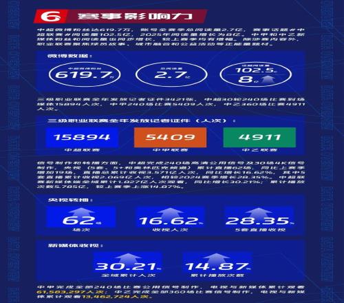 賽事影響力方麵,賽事話題.5億;央視直播了62場中超,累計收視3.571億人次,同比增長16.62%;中超新媒體端全域累計1.827億人次觀看,同比增長30.21%。
