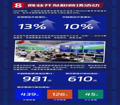 2025賽季中超、中甲、中乙三級聯賽累計現場觀眾人數達8,957,759人次,較2024賽季同比提升18%。