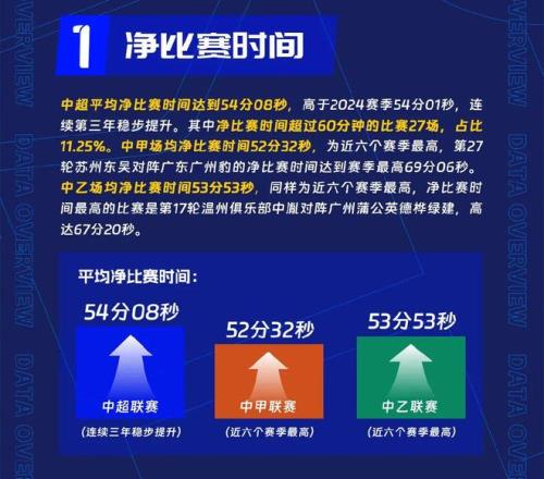 競賽層麵,中超平均淨比賽時間達到54分08秒,高於2024賽季54分01秒,連續第三年穩步提升;中甲場均淨比賽時間52分32秒,為近六個賽季最高;中乙場均淨比賽時間53分53秒,同樣為近六個賽季最高。