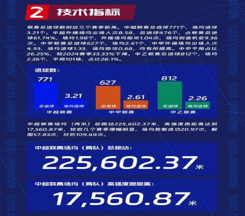 中超場均(兩隊)總跑動225602.37米,高強度跑距離達到17560.87米,較前幾個賽季增幅明顯,場均搶斷成功20.97次,解圍57.83次,對抗109.48次。