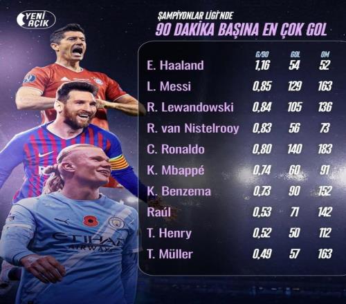 最近Yeni Açık發布了歐冠每90分鍾進球榜單,哈蘭德、梅西、C羅、萊萬這些熟悉的名字全部在列。榜單前十裏,哈蘭德的效率已經甩開前輩一大截,而內馬爾、薩拉赫等熱門前鋒暫時都沒擠進來。就在歐冠改製、強隊場次變多的背景下,這組數字也把一個老問題重新推到桌麵上——在這樣的環境裏,哈蘭德到底有多大機會把C羅的歐冠進球紀錄徹底趕超?