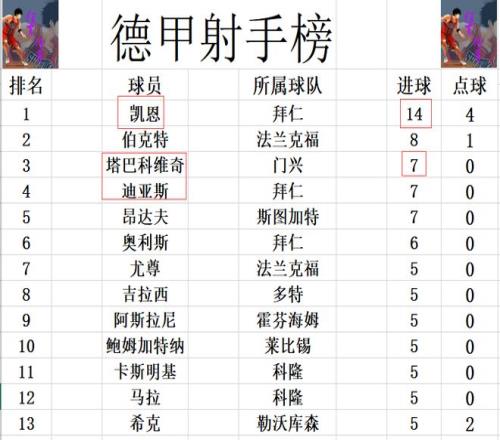 射手榜方麵,前十沒有任何變化,凱恩14球高居榜首,伯克特8球位列第2。塔巴科維奇今天沒有進球,還是和迪亞斯,昂達夫7球並列第3。吉拉西,西克,鮑姆加特納,尤尊等人5球剛好擠入前十。