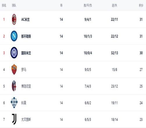 在積分榜上,前2的積分相同。AC米蘭總積分31分,以淨勝球的優勢,登上榜首位置。而同樣31分的那不勒斯隻能屈居第2。國際米蘭以30分排名第3。第4的是羅馬,隻拿到27分,與榜首有4分的差距。博洛尼亞25分排名第5。第6的是科莫,拿到24分。尤文圖斯隻拿到23分,排名第7。拉齊奧和亞特蘭大的戰績都很差。拉齊奧19分排名第10,而亞特蘭大隻有16分排名第12。