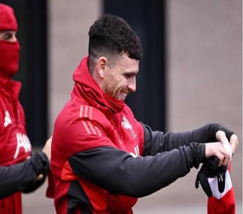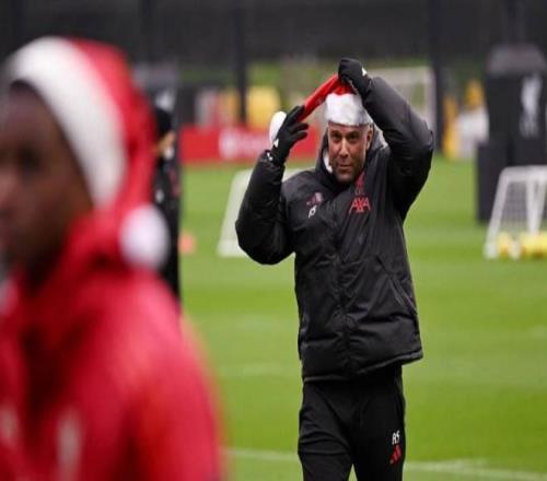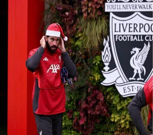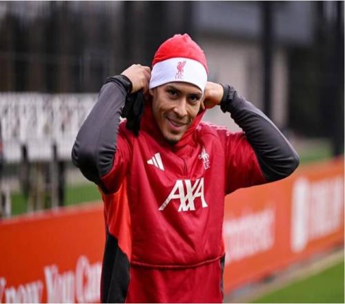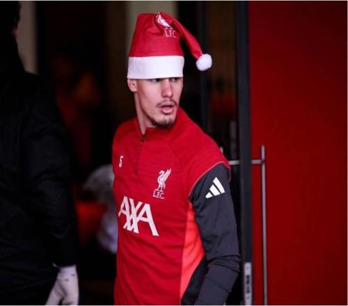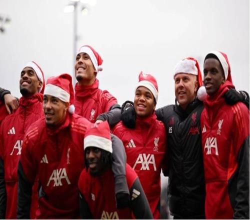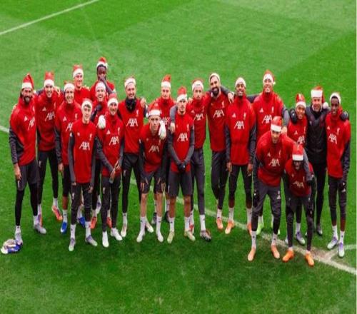 當地時間12月24日上午,利物浦球員戴上聖誕帽參加訓練,並且進行了傳統的合影。