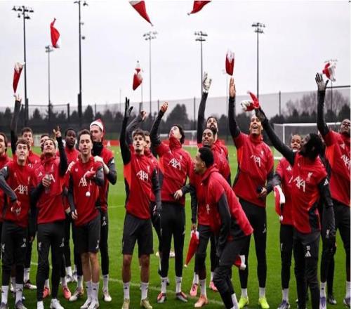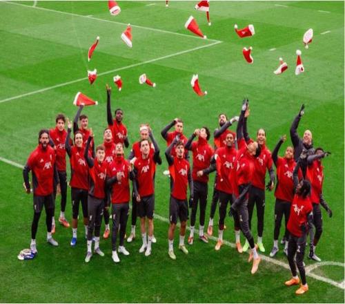 今天是聖誕節前夕,在這一天,利物浦的球員和教練們都戴上了聖誕帽來到訓練場,並且進行了大合影,隨即一起將聖誕帽擲向空中。