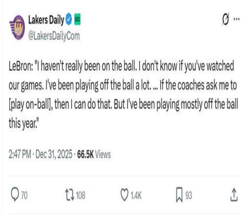 Lakers Daily寫道:“別再試圖讓詹姆斯成為追夢格林,讓他做自己,讓其他人來適應他。”