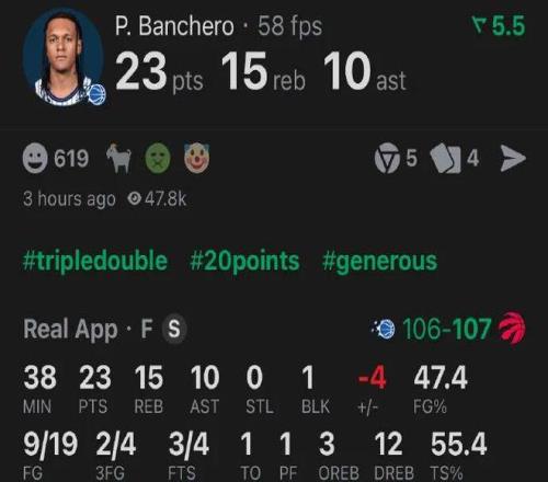 班凱羅又一次打出三雙,全場貢獻23分15籃板10助攻。